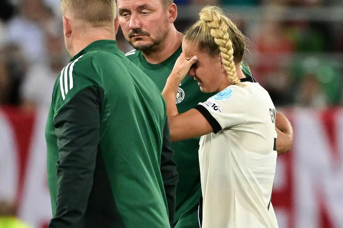 Germany’s Giulia Gwinn leaves the pitch after twisting her knee in the 40th minute.