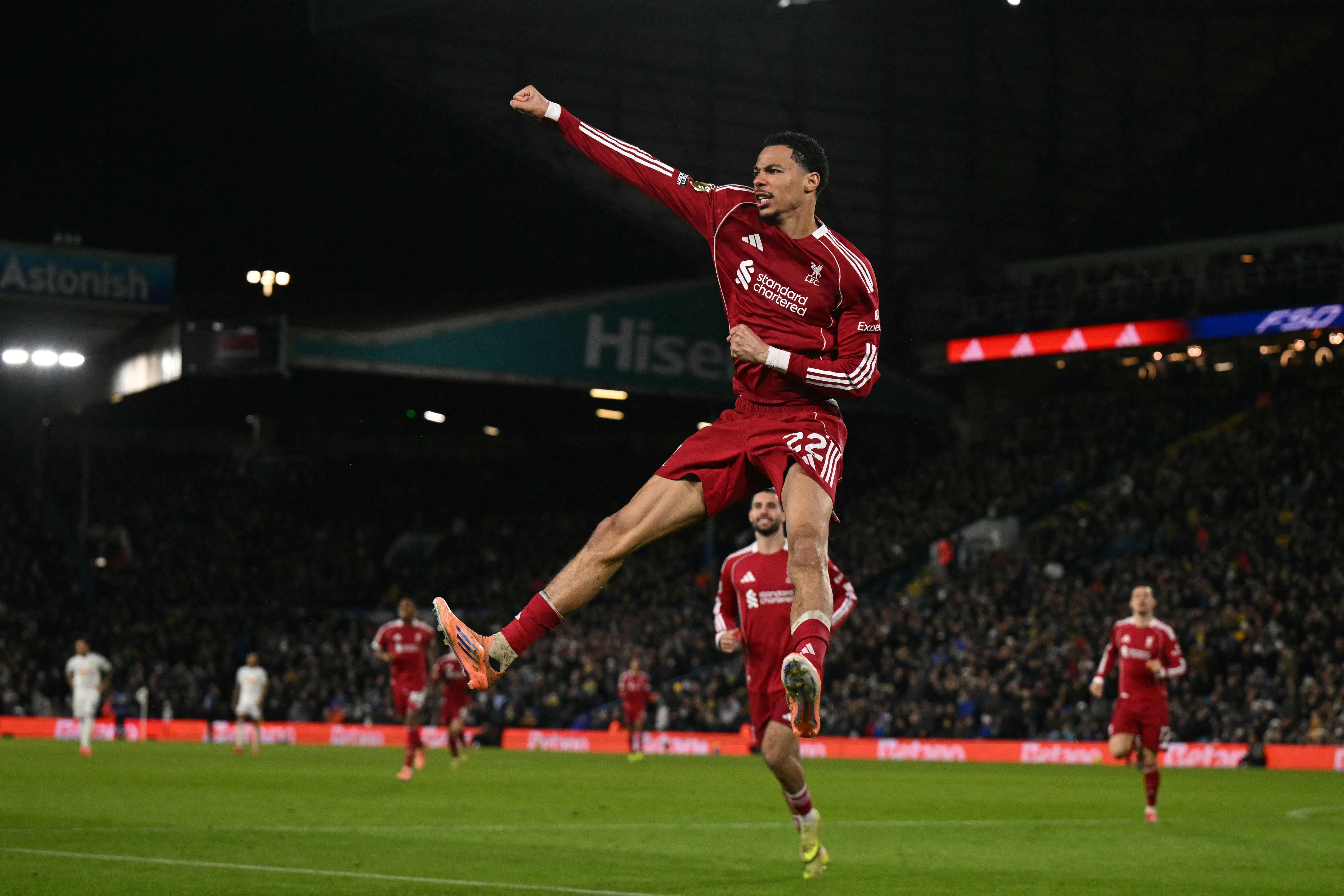 Liverpool striker Hugo Ekitike celebrates after scoring the opening goal against Leeds.