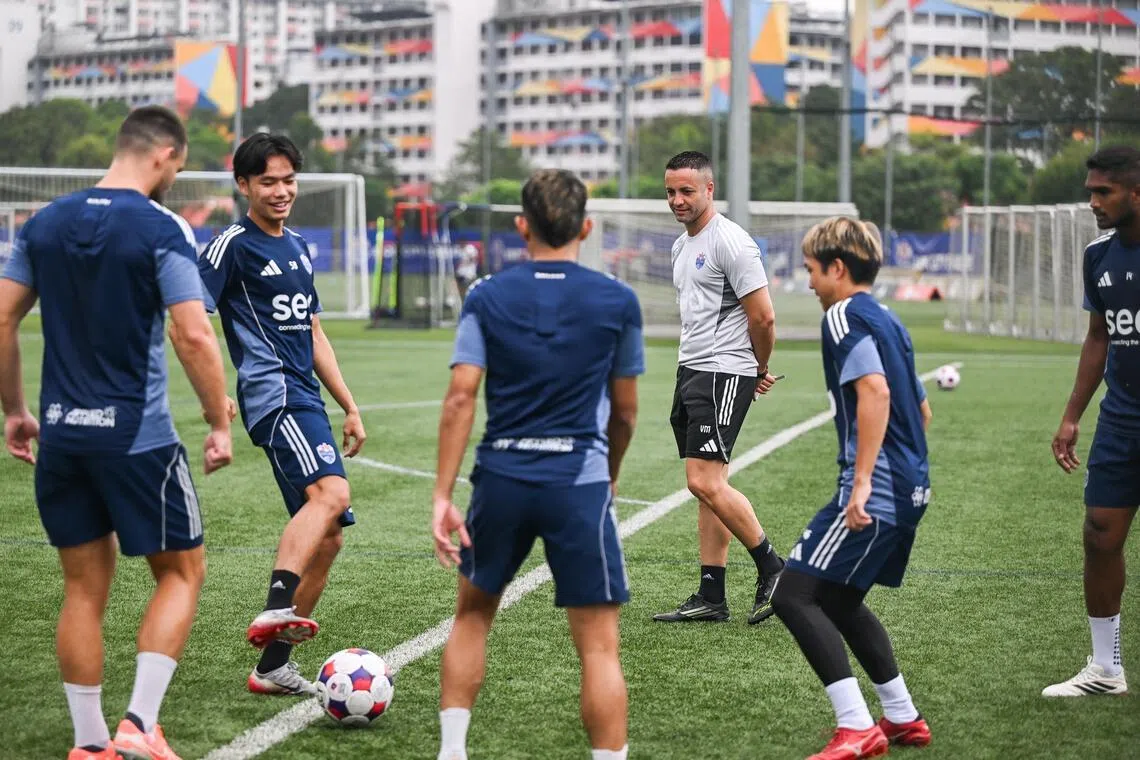 Lion City Sailors interim coach Varo Moreno (in grey) overseeing training at their Mattar Road training centre on Feb 19.