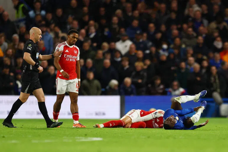 Arsenal’s Mikel Merino grabbing his ankle after a challenge made by Moises Caicedo of Chelsea on the Spaniard during their 1-1 English Premier League draw at Stamford Bridge on Nov 30. Caicedo was duly shown a red card by referee Anthony Taylor after an on-field review by the video assistant referee.