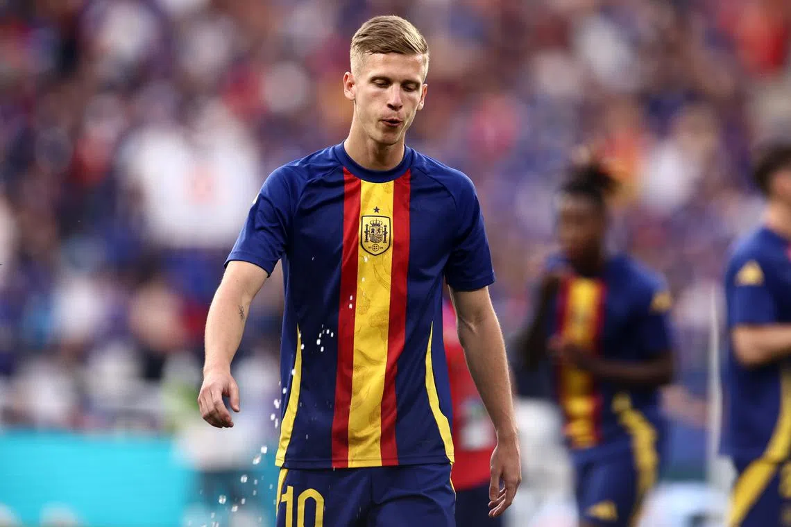 Dani Olmo of Spain warms up ahead of the UEFA EURO 2024 semi-finals soccer match between Spain and France.
