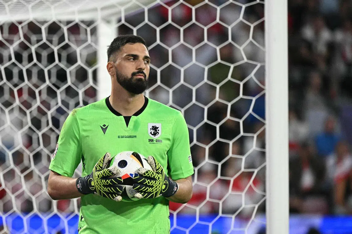 Georgia’s goalkeeper #25 Giorgi Mamardashvili holds the ball during the UEFA Euro 2024 round of 16 football match between Spain and Georgia.