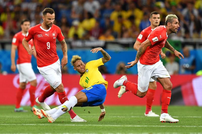 Brazil's forward Neymar (centre) falls during the Russia 2018 World Cup Group E football match between Brazil and Switzerland at the Rostov Arena in Rostov-On-Don on June 17, 2018.