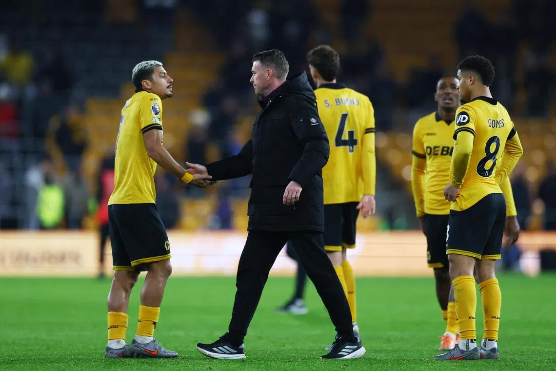 Wolverhampton Wanderers manager Rob Edwards greeting his players such as Joao Gomes and Andre after their loss to Brentford.