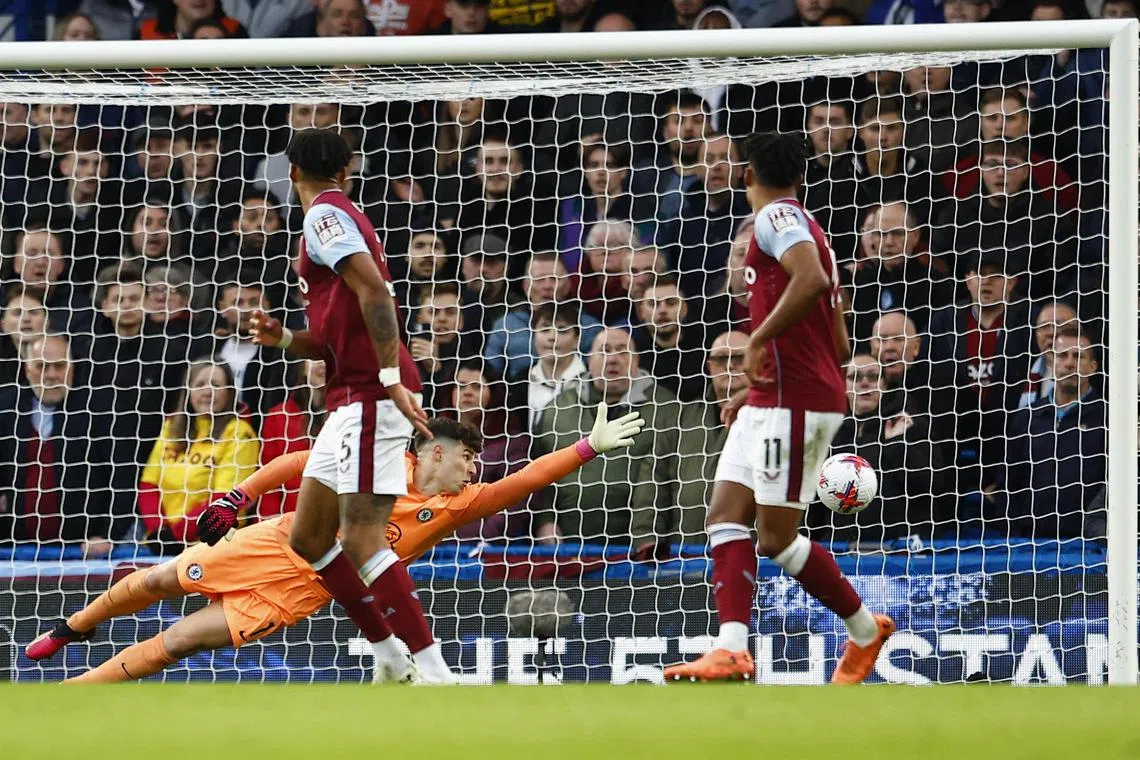 Aston Villa’s John McGinn scores their second goal past Chelsea’s Kepa Arrizabalaga.