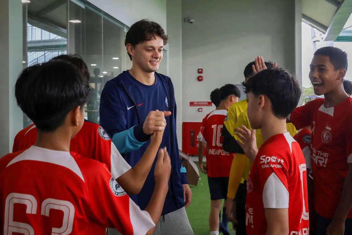 Perry Ng, an England-born footballer interacting with youth league players at Kallang Football Hub on March 23, 2025. He is currently a Singapore permanent resident and is looking to get his citizenship and play for the Lions.