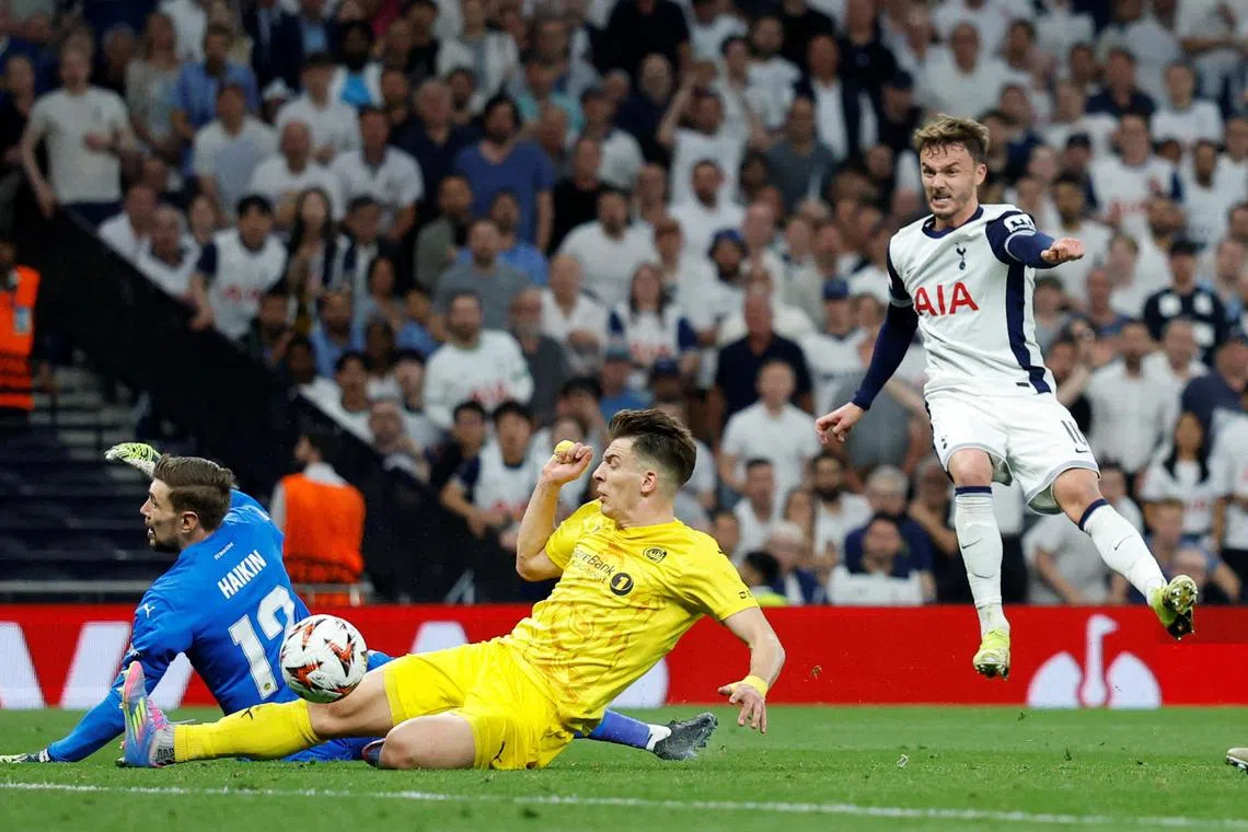 Tottenham Hotspur’s James Maddison scores their second goal past Bodo/Glimt’s Nikita Haikin.