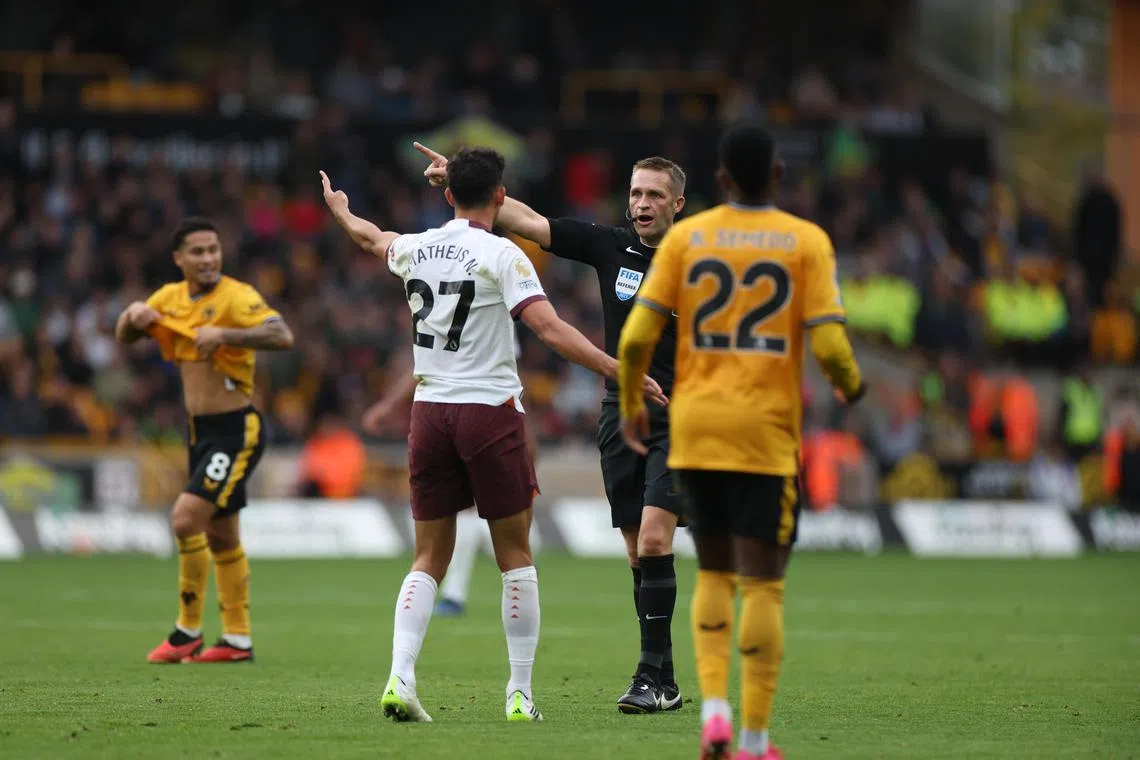 City’s Matheus Nunes argues with referee Craig Pawson during the match.