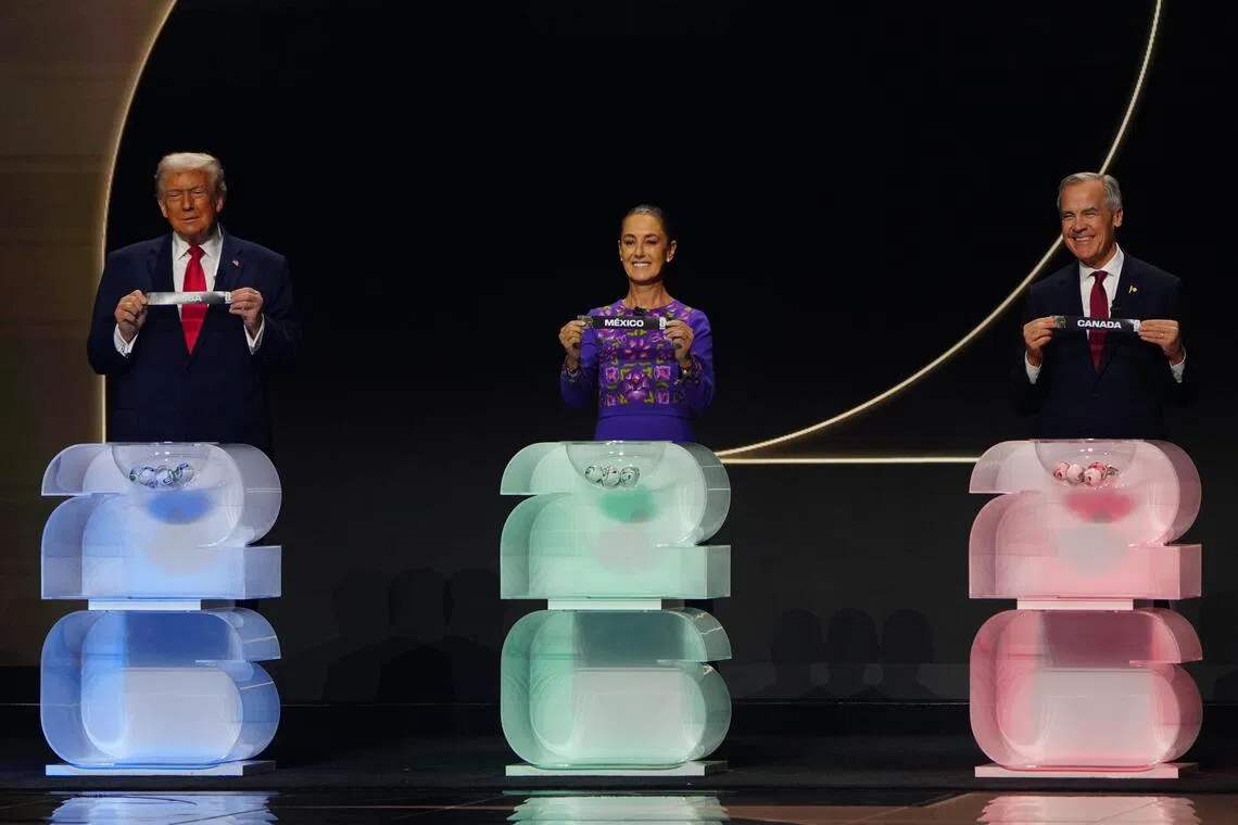 (From left) US President Donald Trump, Mexican President Claudia Sheinbaum and Canadian Prime Minister Mark Carney taking part in the Dec 5 World Cup in Washington.