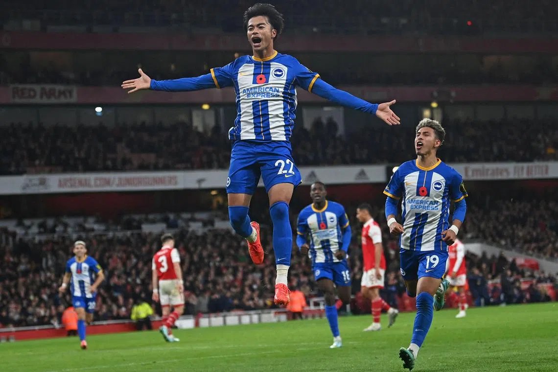Brighton’s Japanese midfielder Kaoru Mitoma celebrating his goal during the English League Cup third-round match against Arsenal on Nov 9.