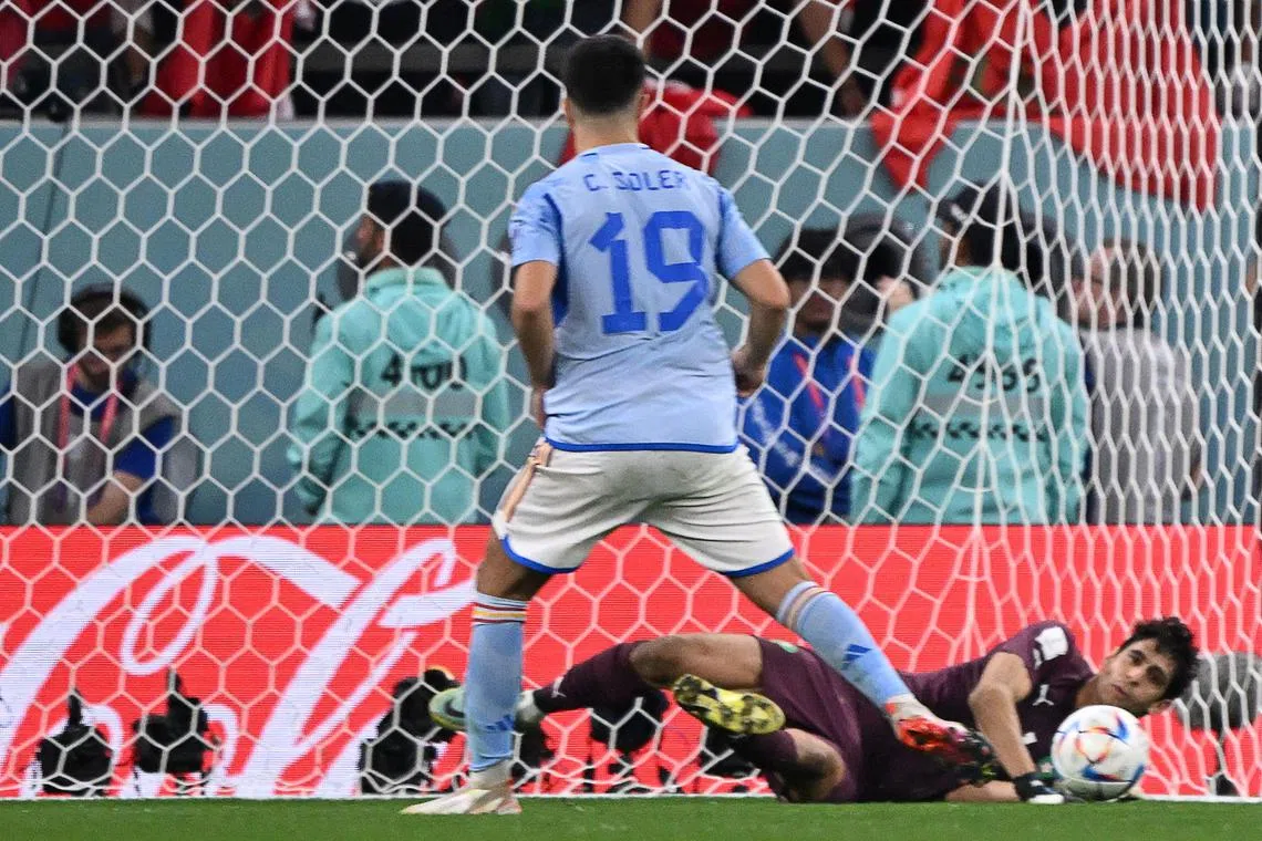 Yassine Bounou dives to save a shot by Spain's midfielder Carlos Soler during penalty shoot-out.