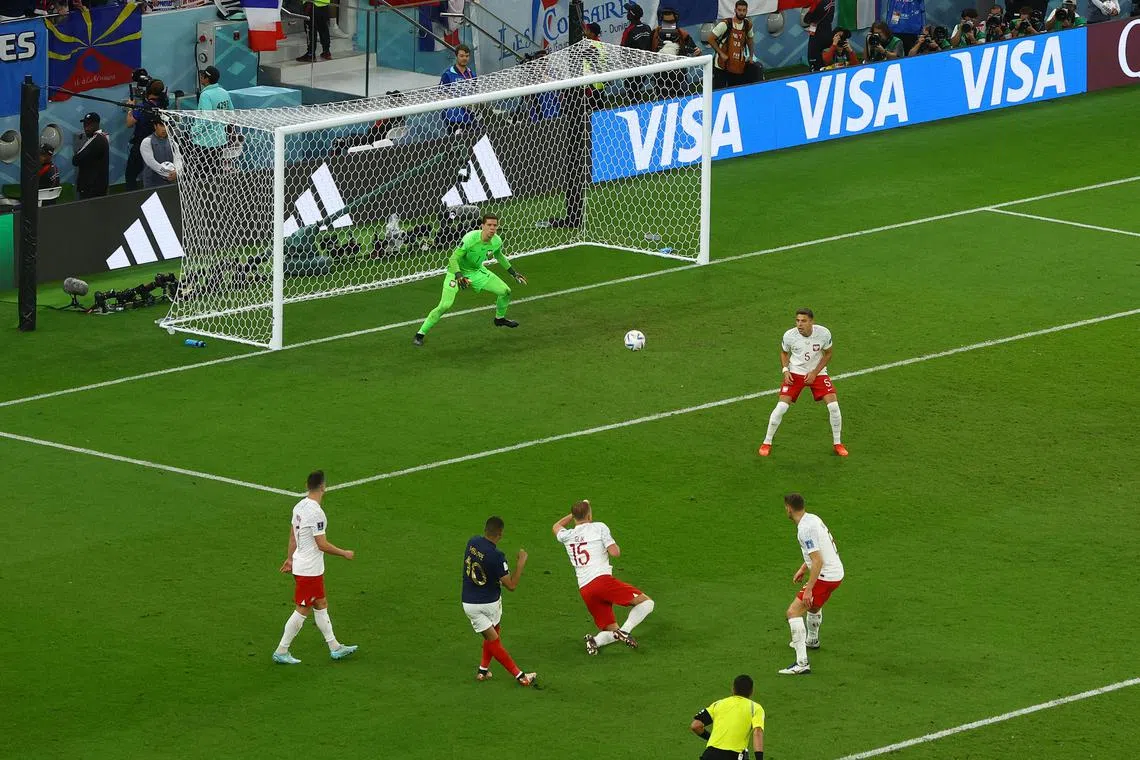 France’s Kylian Mbappe (in blue) scores France’s third goal during the round of 16 match against Poland on Dec 4, 2022.