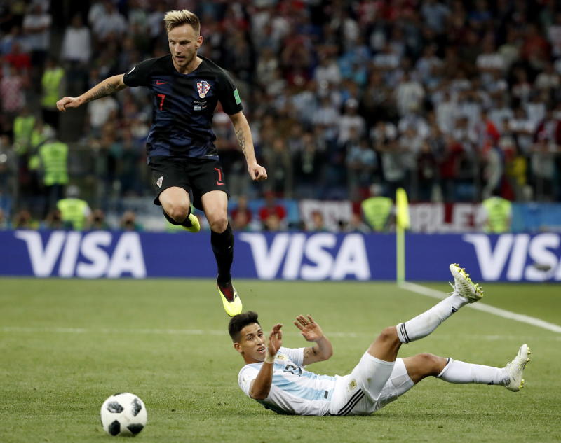Ivan Rakitic (left) of Croatia and Maximiliano Meza of Argentina in action during the FIFA World Cup 2018 group D preliminary round soccer match between Argentina and Croatia in Nizhny Novgorod, Russia, on June 21, 2018.