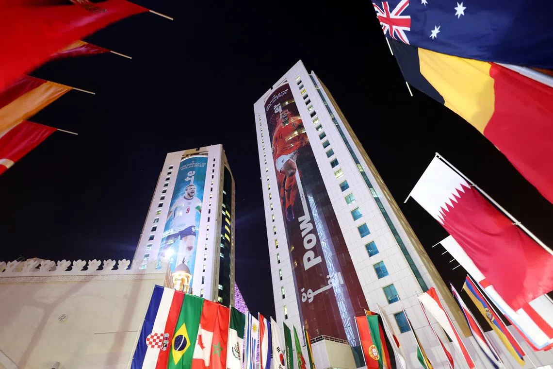 Gigantic images of the stars of world football – England’s Harry Kane, South Korea’s Son Heung-min and Canada’s Alphonso Davies, among them – are plastered on skyscrapers overlooking the West Bay.