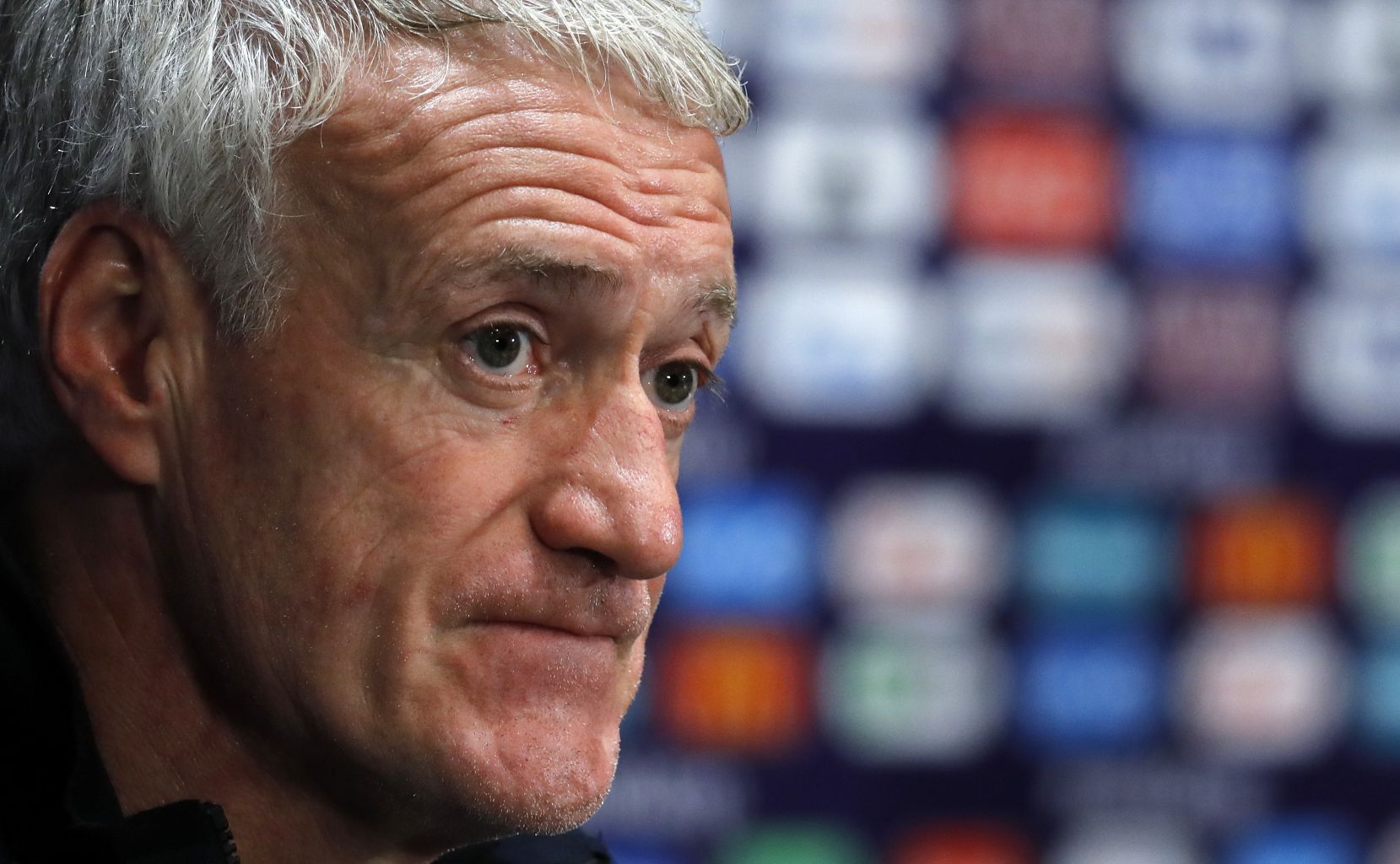 French head coach Didier Deschamps attends a press conference in Moscow.
