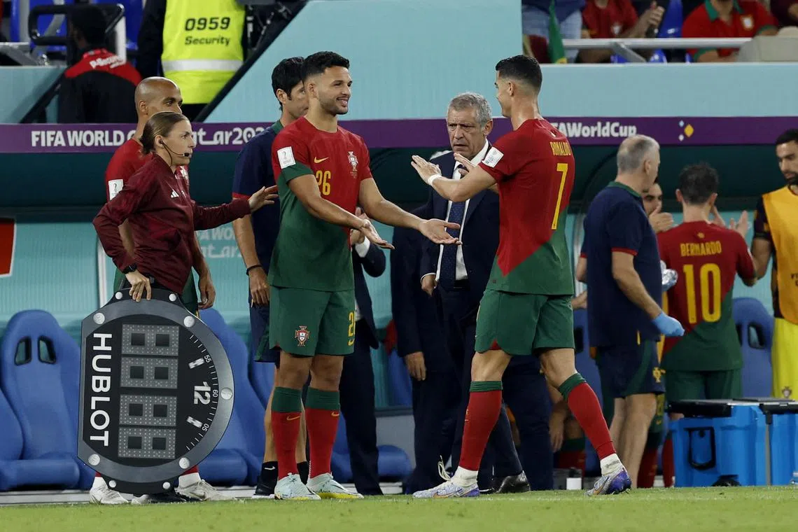 Goncalo Ramos (left) comes on as a substitute for Cristiano Ronaldo in the match against Ghana on Nov 24.