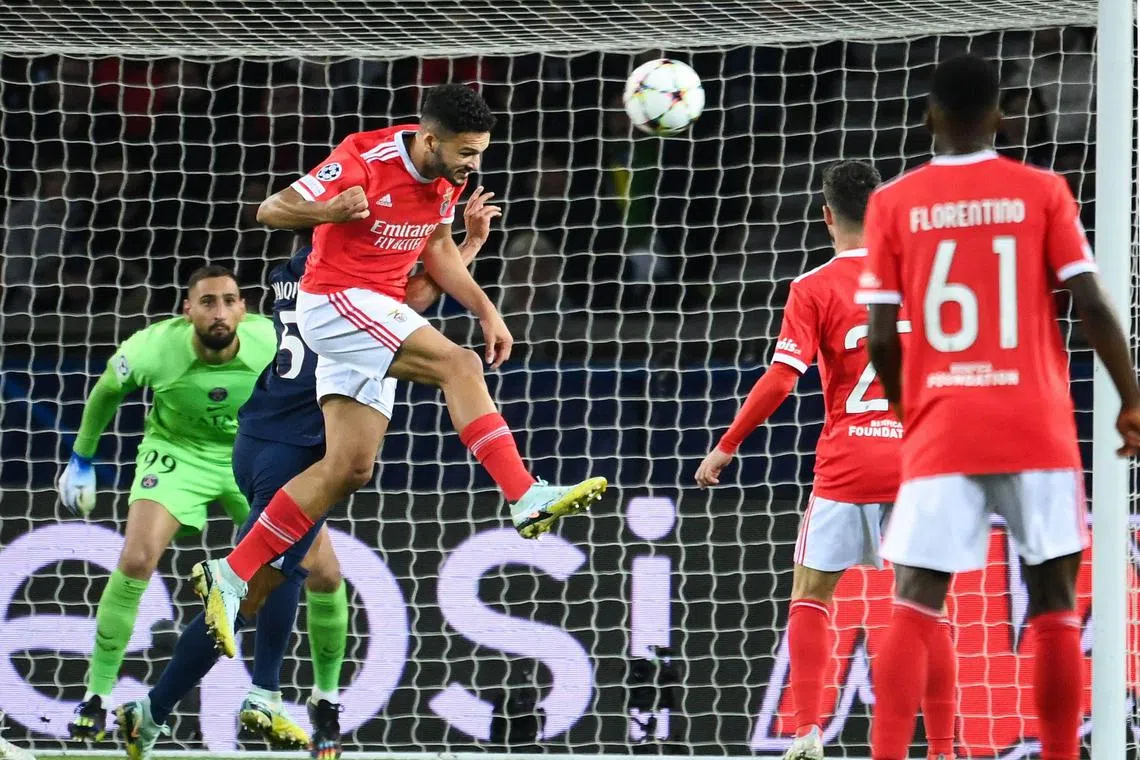 Goncalo Ramos (centre) heads the ball during the Champions League game against Paris Saint-Germain.