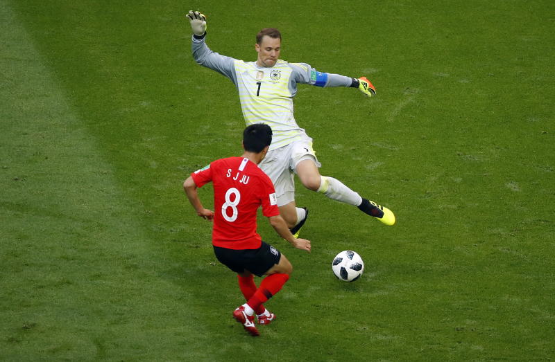 Goalkeeper Manuel Neuer of Germany (right) and Ju Se-jong of South Korea in action during the Fifa World Cup 2018 group F preliminary round soccer match between South Korea and Germany in Kazan, Russia, on June 27, 2018.