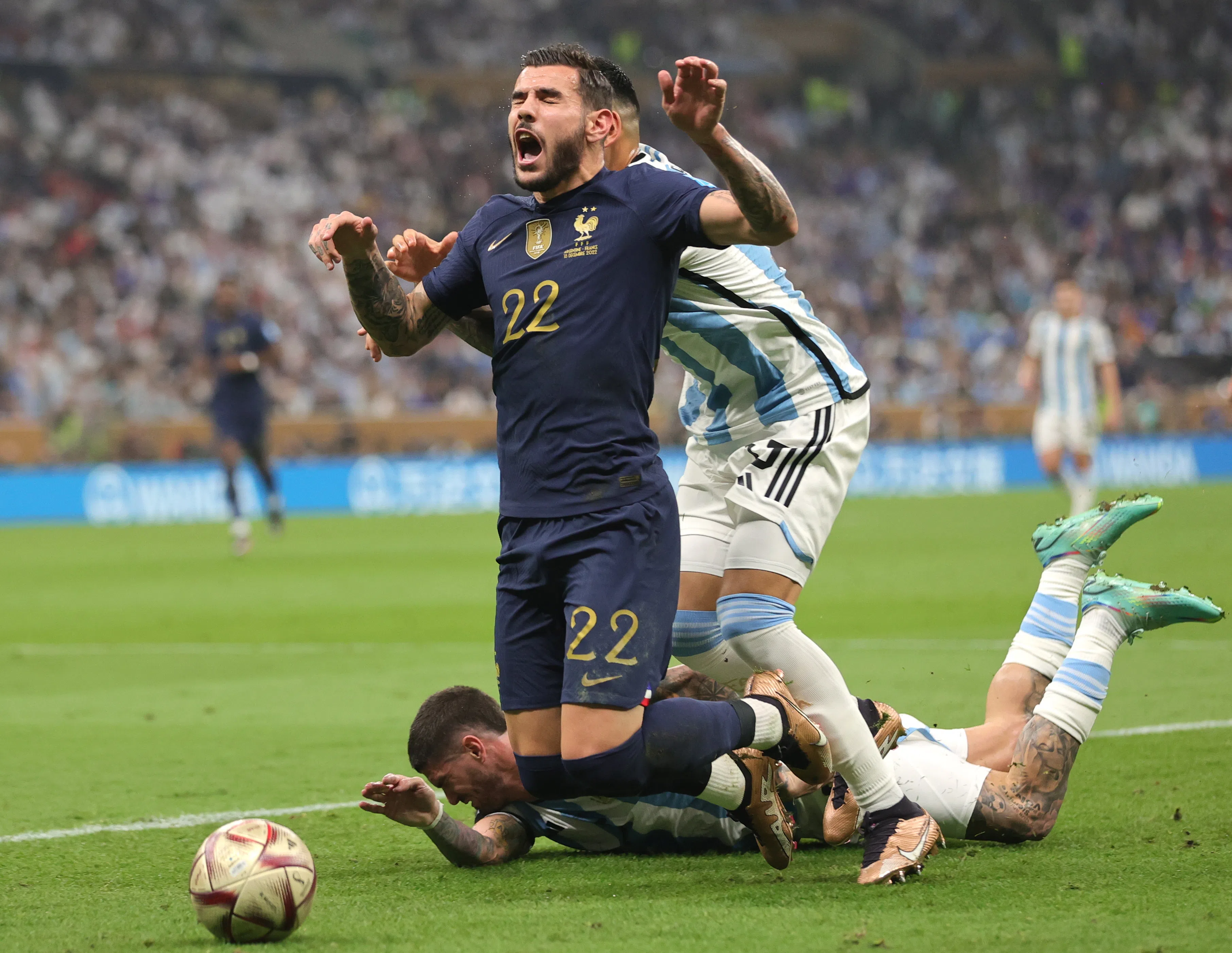 Theo Hernandez of France being tackled by Cristian Romero of Argentina.