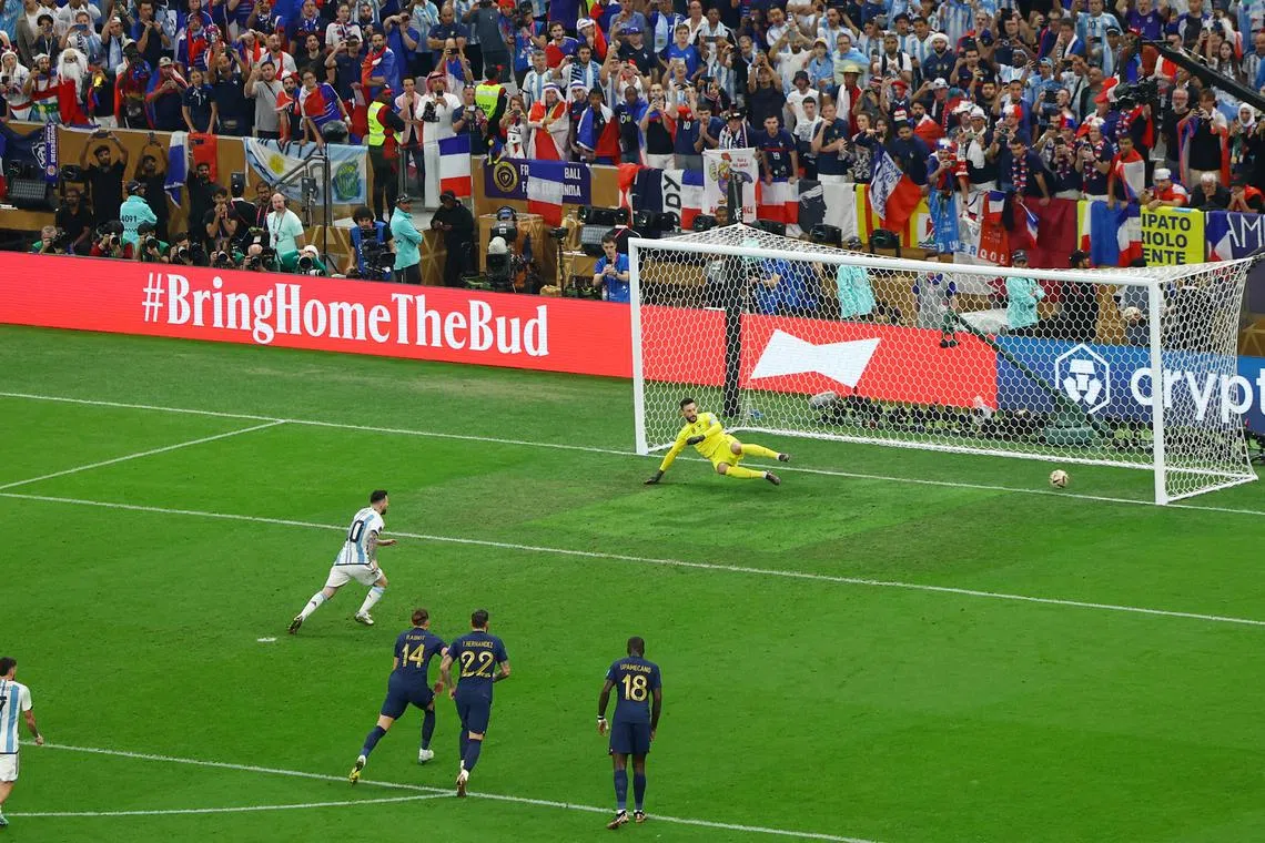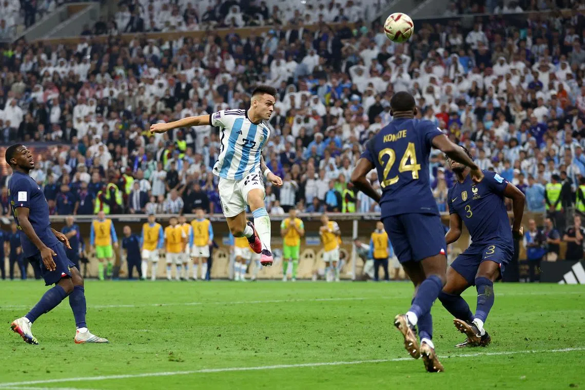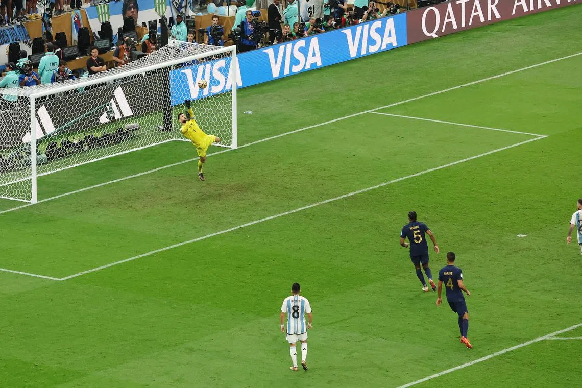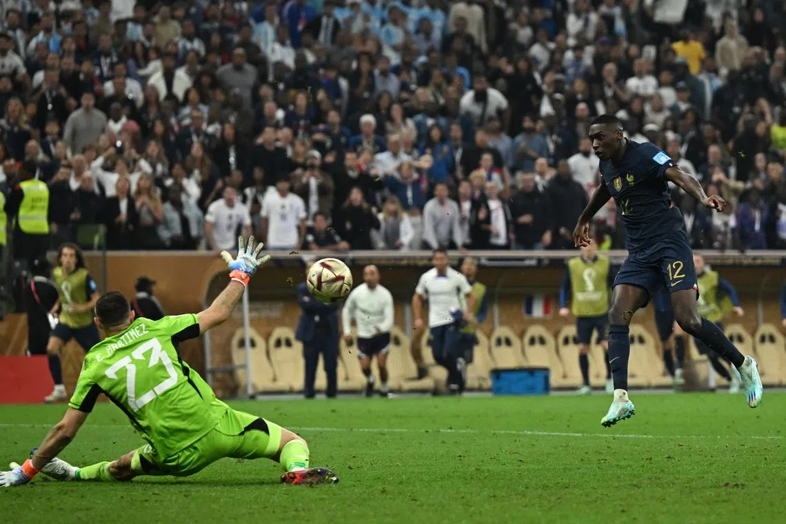 In the dying minutes of extra time, Kolo Muani is one on one with Emiliano Martinez, who makes the save of his life. Then Messi skitters down the right and crosses for Lautaro Martinez in the middle. He heads wide from 10 metres. The match ends 3-3 after extra time and goes to penalties.