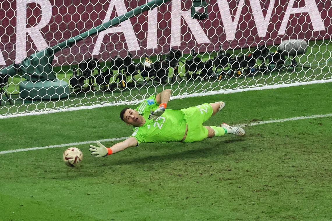 Argentina’s goalkeeper Emiliano Martinez deflects a shot from France midfielder Aurelien Tchouameni during the penalty shootout.