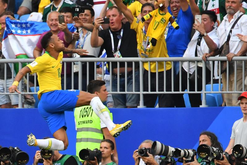 Brazil's forward Neymar celebrates after scoring the opening goal during the Russia 2018 World Cup round of 16 football match between Brazil and Mexico at the Samara Arena in Samara on July 2, 2018.