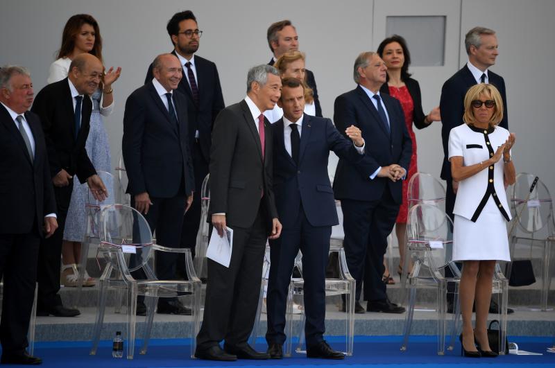 Prime Minister Lee Hsien Loong speaks to French President Emmanuel Macron during the France's Bastille Day celebrations on the Champs-Elysees Avenue in Paris on July 14, 2018.