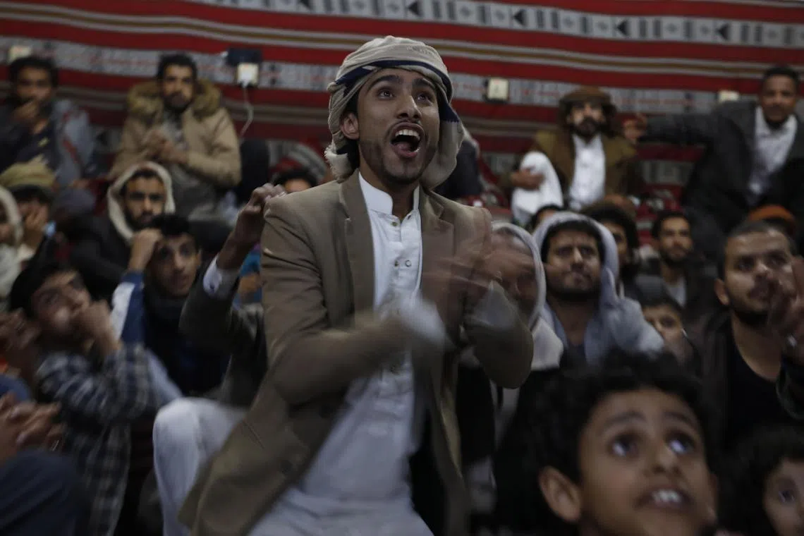 Yemeni soccer fans watch a live broadcast of the semi-final soccer match between France and Morocco, in Sana’a, Yemen, on Dec 14.