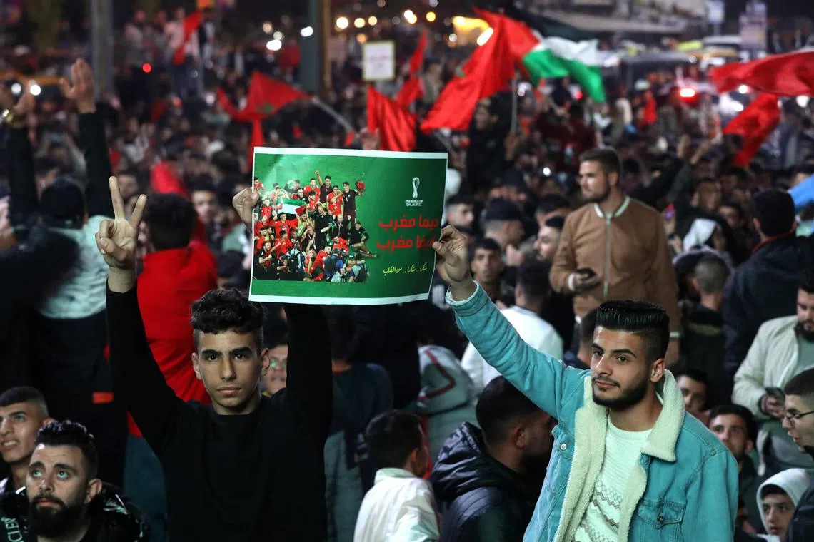 Palestinians hold a picture showing the Moroccan team as they watch the semi-final match in the West Bank city of Nablus, on Dec 14.