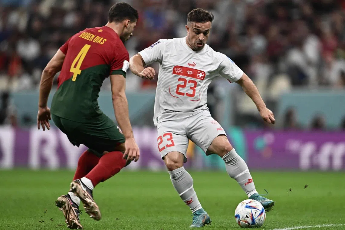 Portugal defender Ruben Dias (left) and Switzerland midfielder Xherdan Shaqiri fight for the ball.