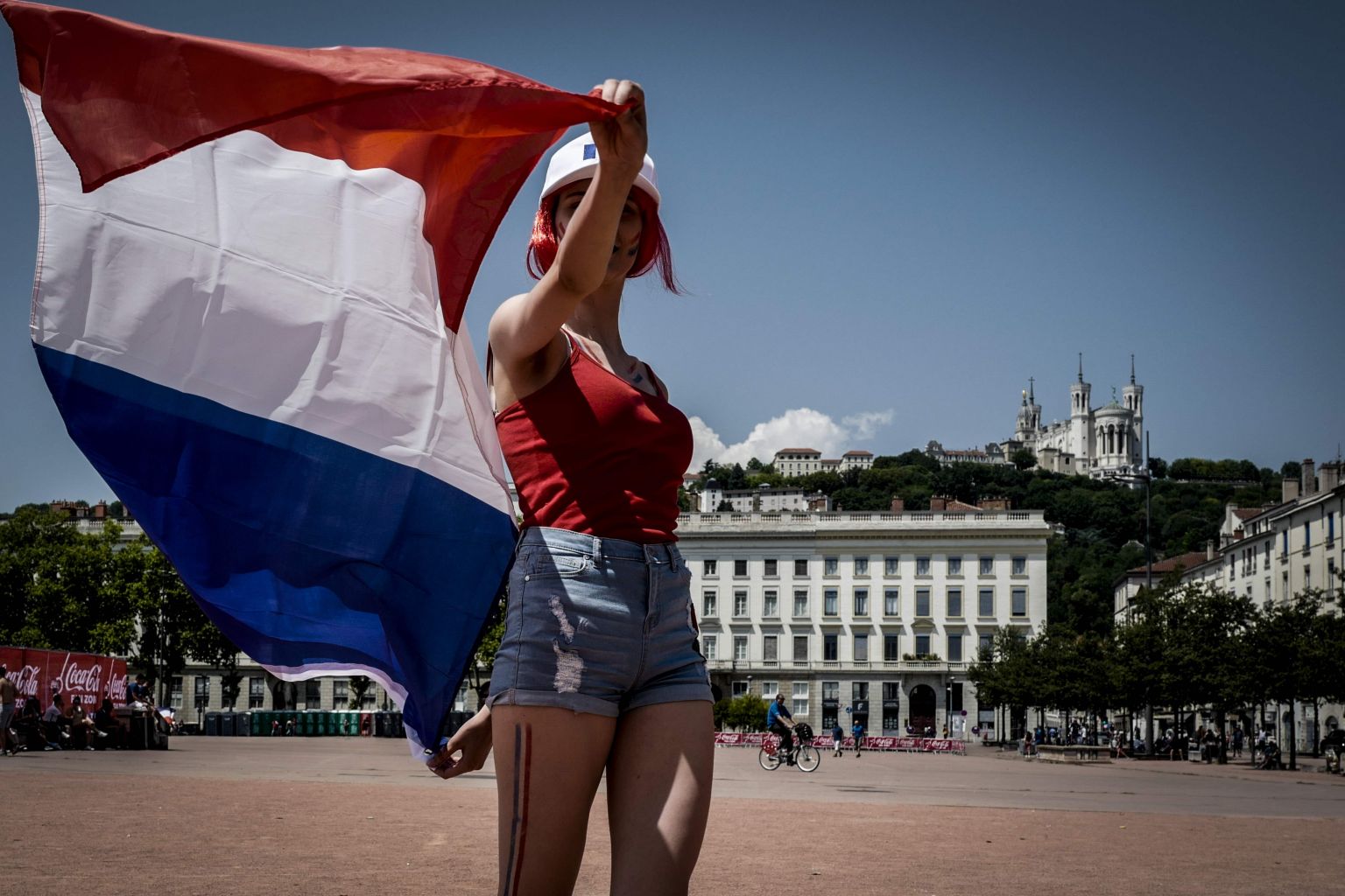 A French fan holding up the national flag in Lyon ahead of the national team's World Cup final match against Croatia, on July 15, 2018.