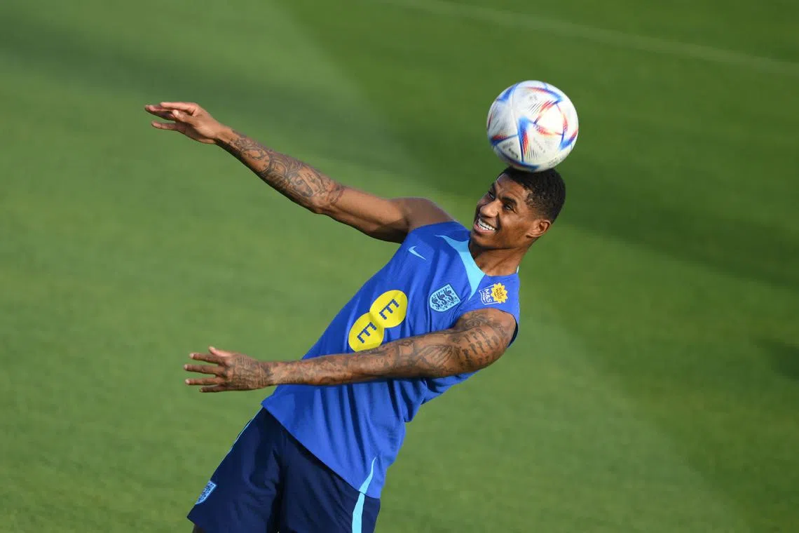 TOPSHOT - England's forward Marcus Rashford takes part in a training session at Al Wakrah SC Stadium in Al Wakrah, south of Doha, on December 1, 2022, during the Qatar 2022 World Cup football tournament. (Photo by Nicolas TUCAT / AFP)