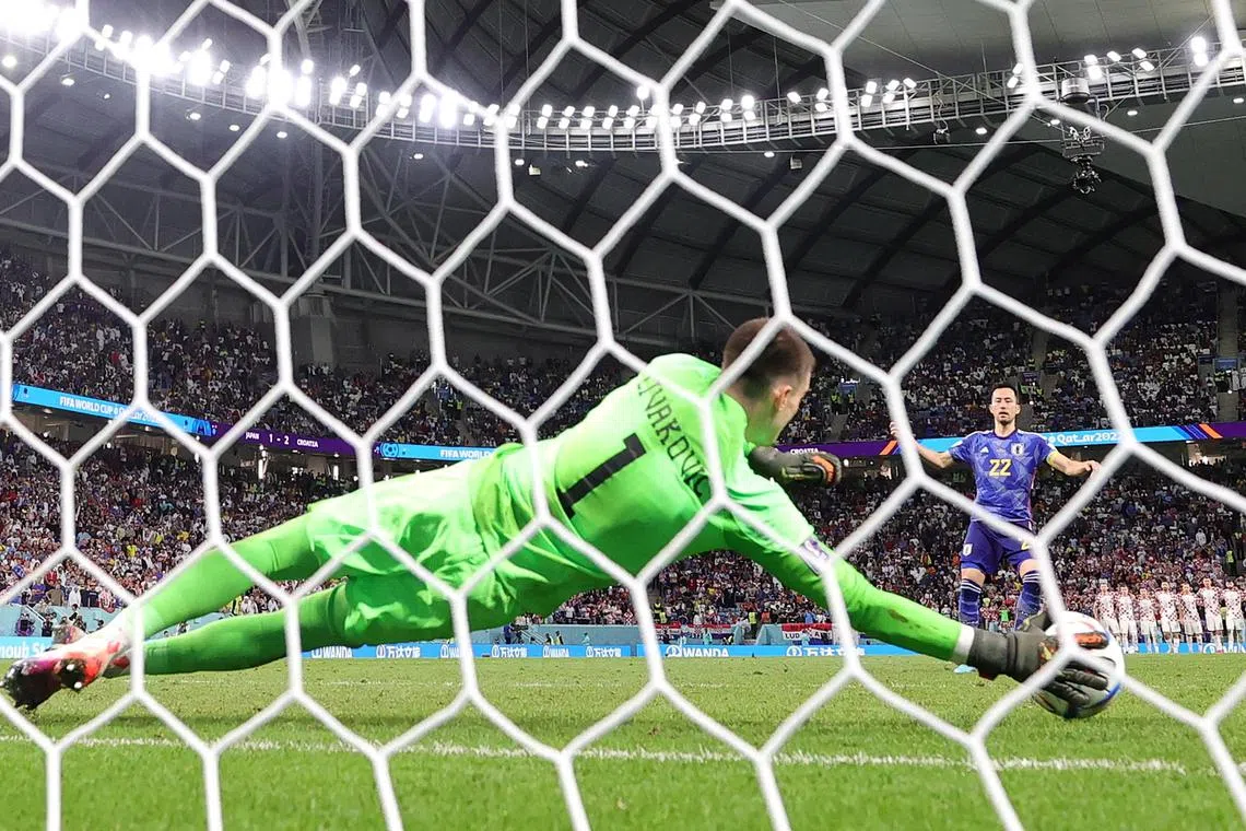 Croatia's goalkeeper Dominik Livakovic saves the penalty from Japan's Takumi Minamino.