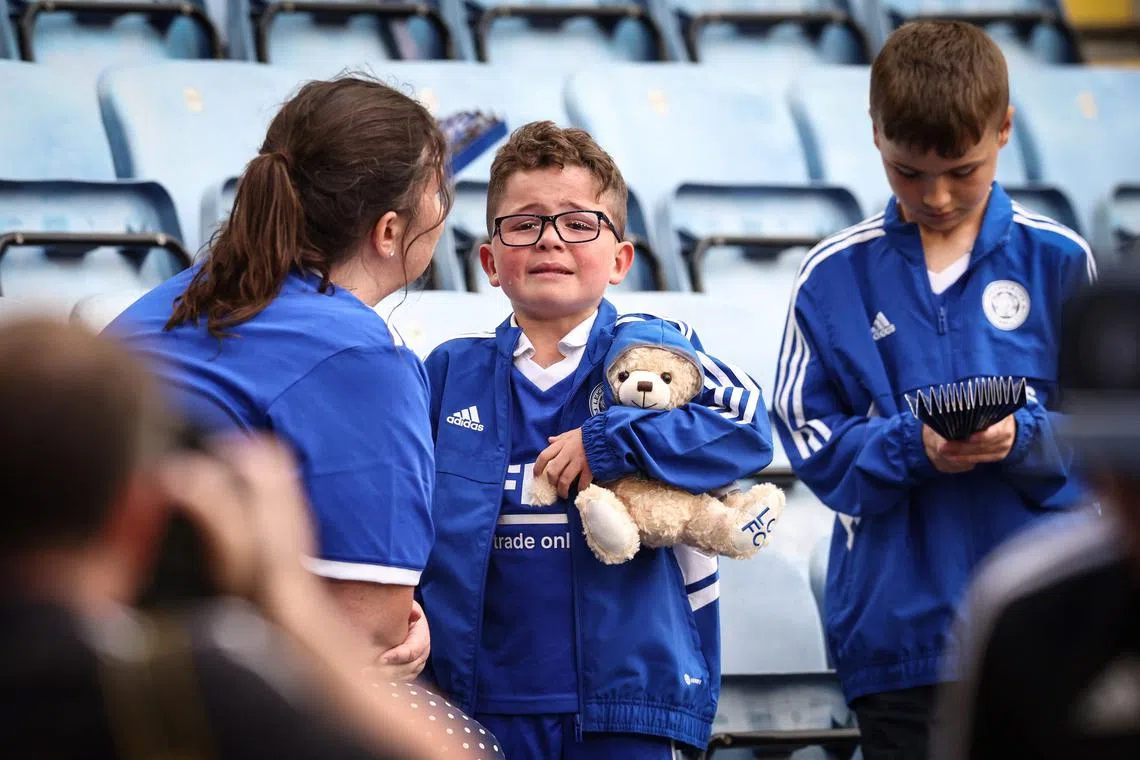 A Leicester City fan crying at the end of the club’s 2-1 win against West Ham United on Sunday.