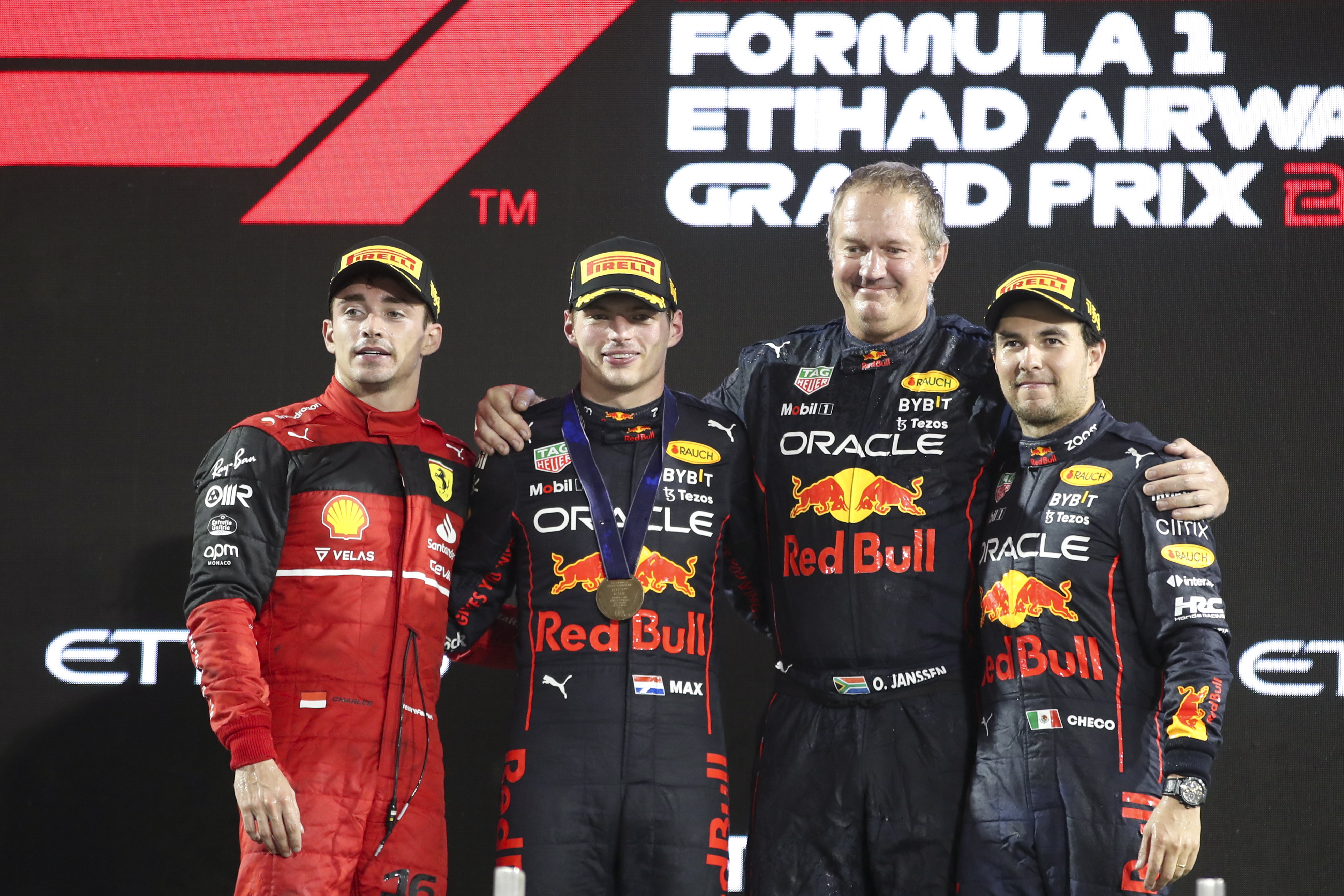 (From left) Ferrari's Charles Leclerc, Red Bull's Max Verstappen , a Red Bull official and Sergio Perez on the podium following the Abu Dhabi Grand Prix on Nov 20, 2022.