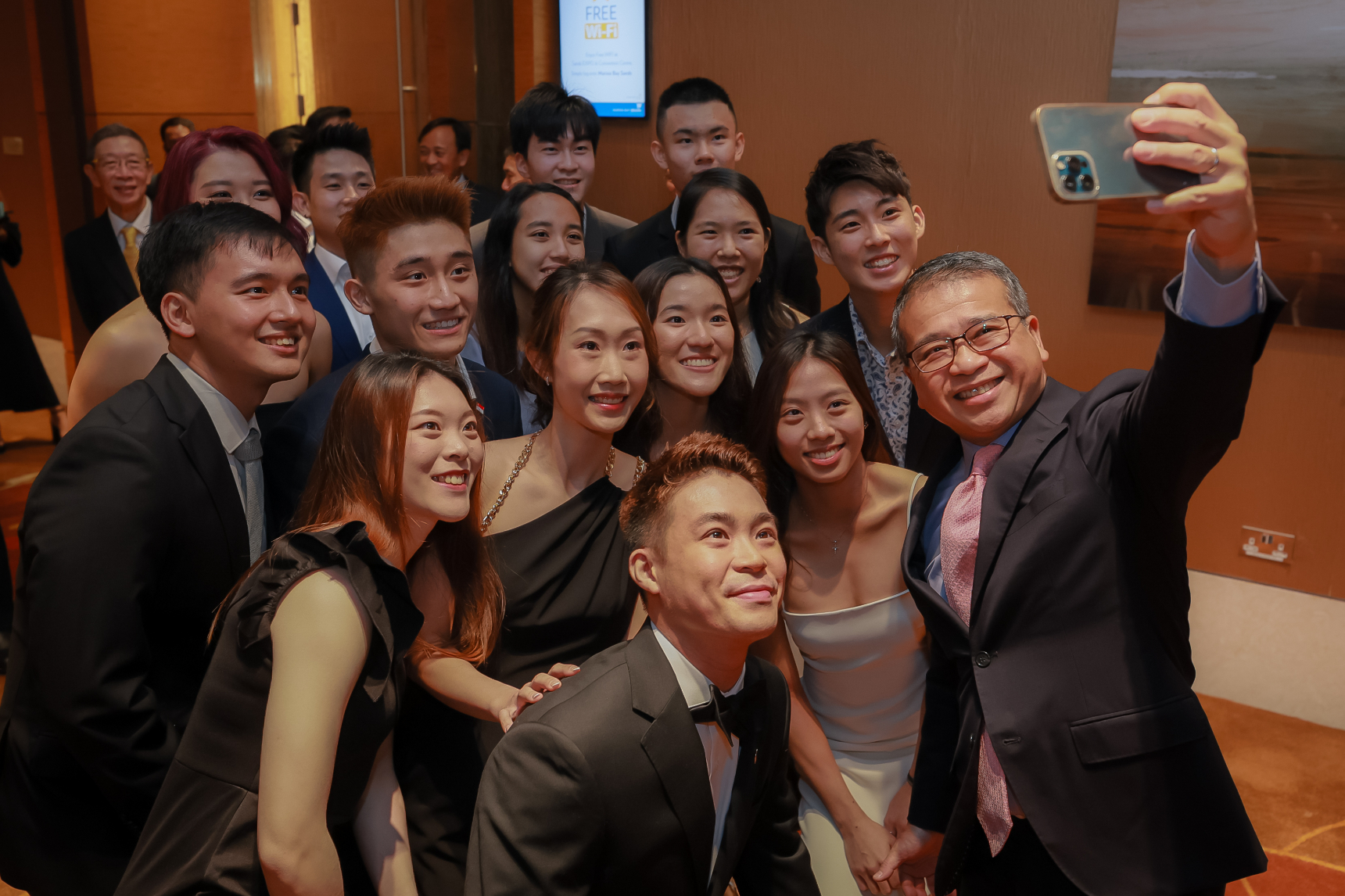 Minister for Culture, Community and Youth Edwin Tong taking a group picture with Singapore badminton national players.