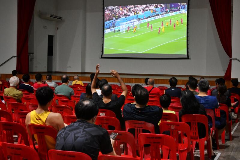 Foottball fans watching the live screening of World Cup opening match at Toa Payoh West Community Club on Nov 21, 2022.