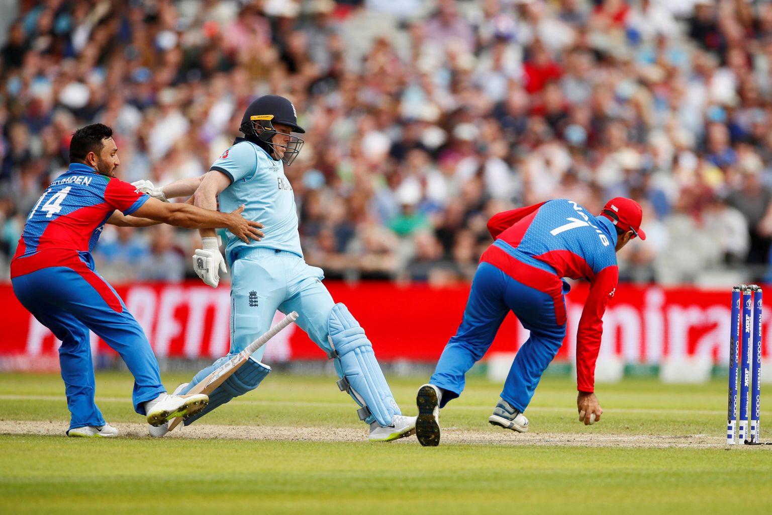 On the field, hosts England, aided by some sloppy Afghanistan fielding, piled up their highest World Cup score of 397-6, with captain Eoin Morgan hitting a one-day international record 17 sixes in his 148.
