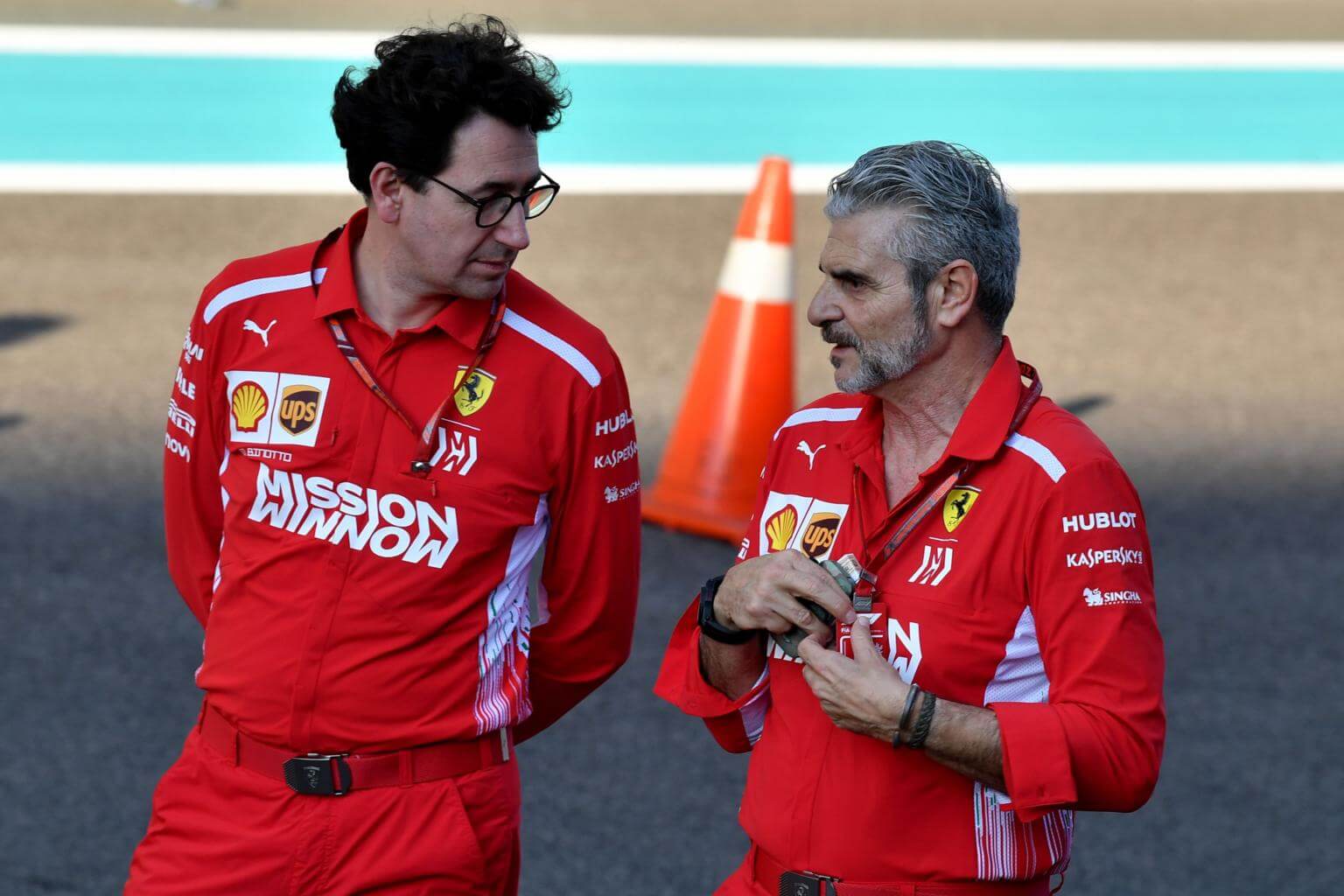 Ferrari Team Principal Maurizio Arrivabene (right) talks to Ferrari technical director Mattia Binotto ahead of the Abu Dhabi Formula One Grand Prix at the Yas Marina circuit, on Nov 22, 2018.