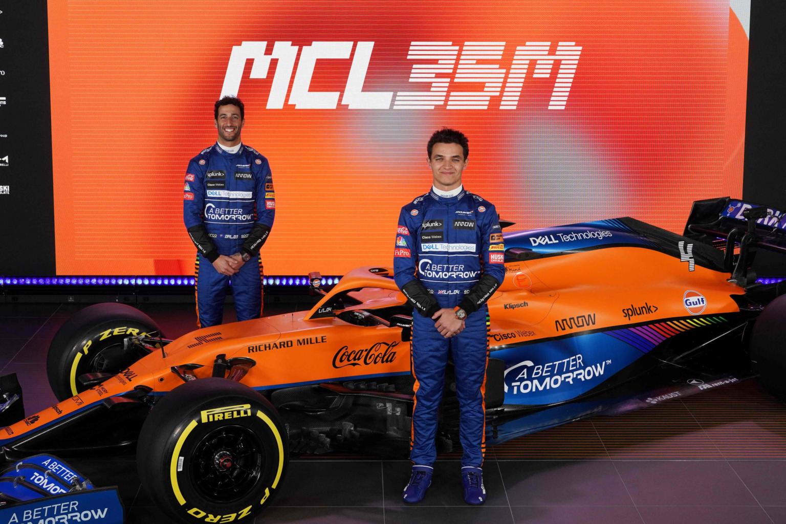 McLaren's British driver Lando Norris (right) and Australian driver Daniel Ricciardo posing by the new McLaren Formula 1 car MCL35M in London.