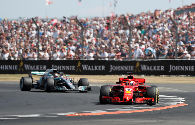 Ferrari's Sebastian Vettel leading Mercedes' Lewis Hamilton during the British Grand Prix, on July 8, 2018.