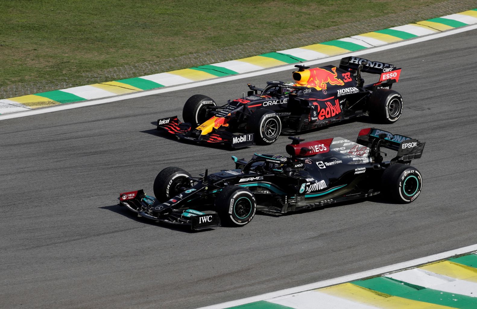 Mercedes' Lewis Hamilton (front) and Red Bull's Max Verstappen compete during the Brazil grand prix.