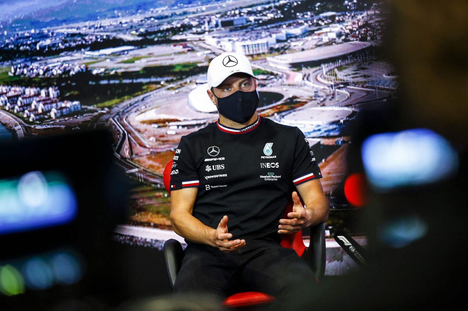 Mercedes' Valtteri Bottas addresses the drivers' press conference ahead of the Russian grand prix.