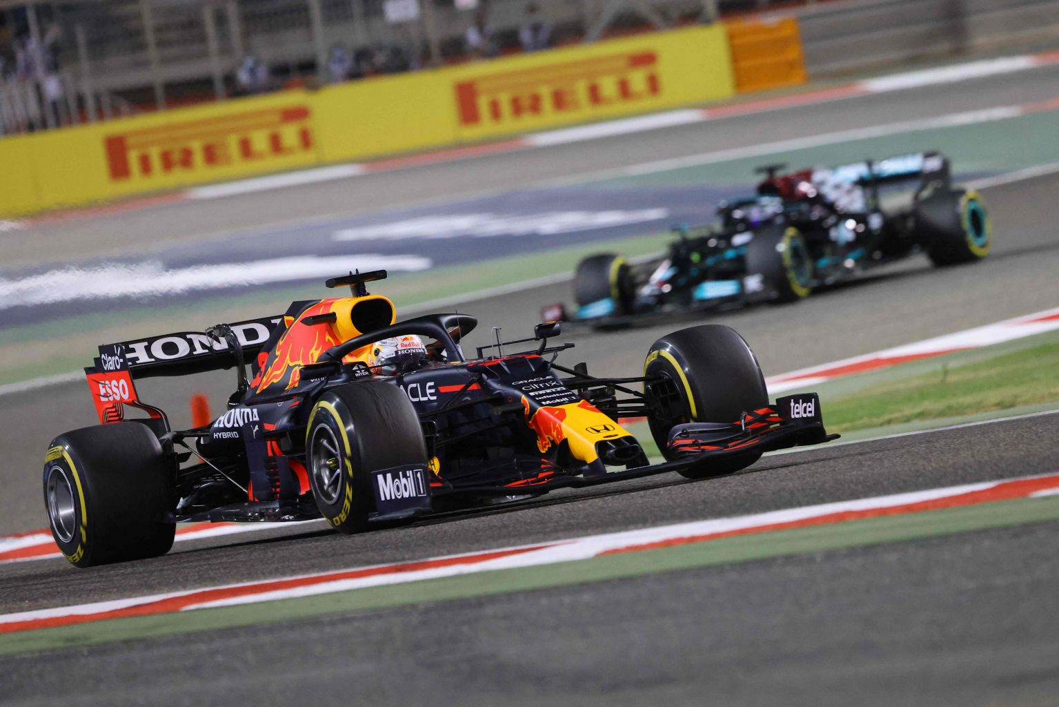 Red Bull's Max Verstappen leads Mercedes' Lewis Hamilton during the Bahrain Formula One Grand Prix on March 28, 2021.