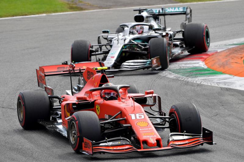 Ferrari's Charles Leclerc (front) ahead of Mercedes' Lewis Hamilton during the Italian Grand Prix at the Autodromo Nazionale circuit in Monza on Sept 8, 2019.