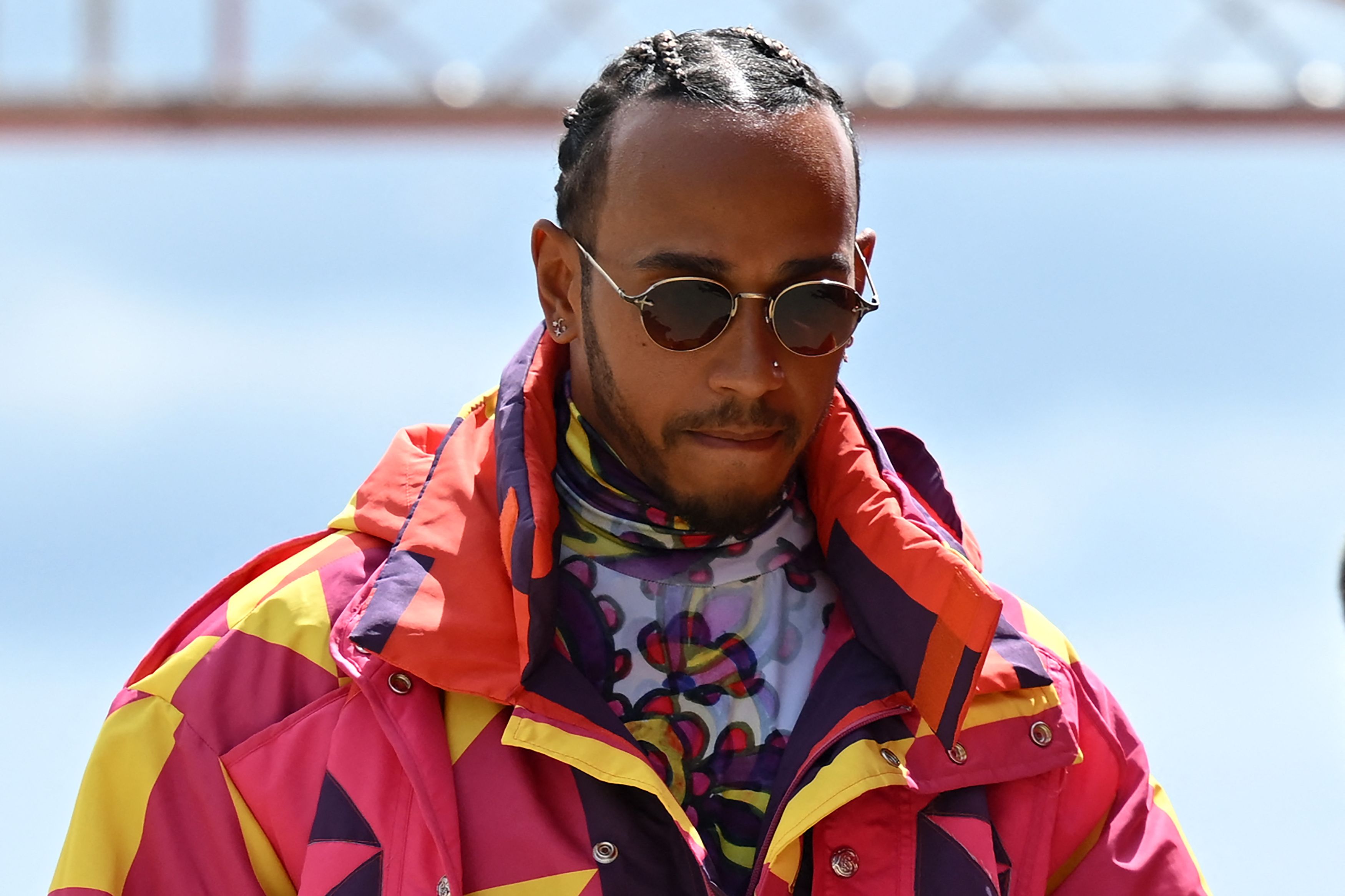 Mercedes' Lewis Hamilton arrives in the paddock ahead of the Formula One British Grand Prix, on June 30, 2022.