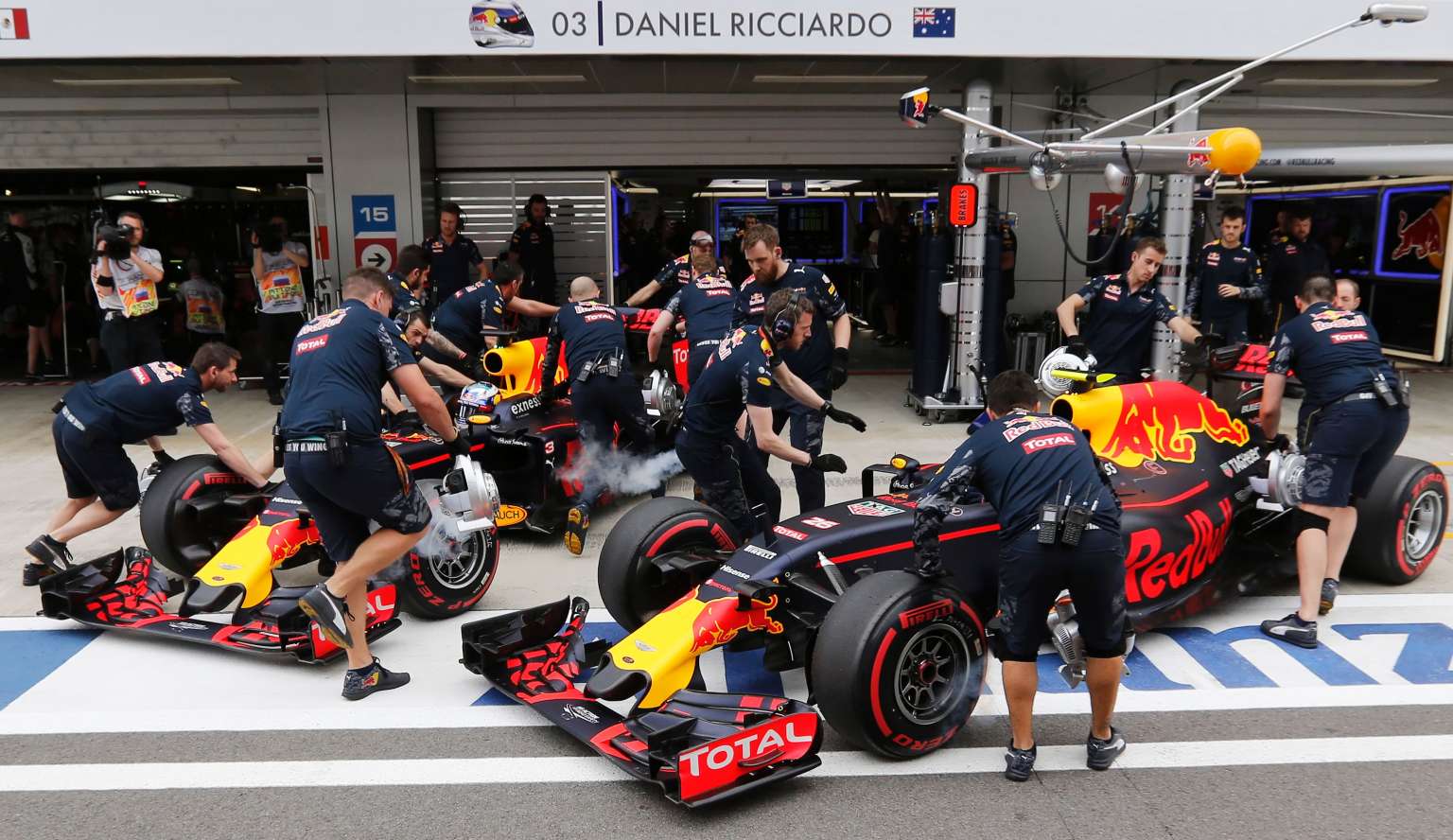 Mechanics work on the cars of Red Bull Racing's Russian driver Daniil Kvyat on April 30, 2016.