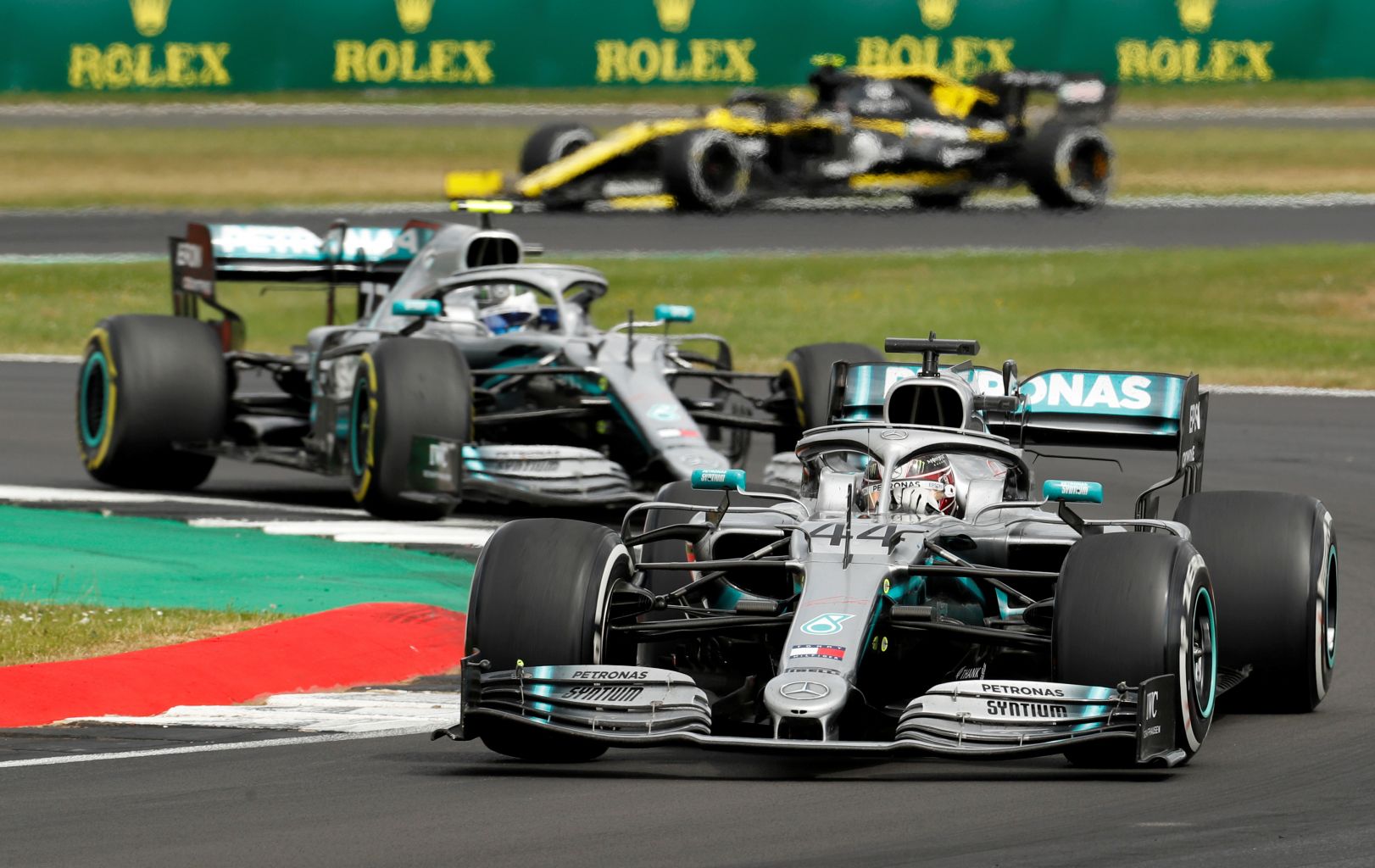 Mercedes' Valtteri Bottas leads team mate Lewis Hamilton at the first corner of the British grand prix in 2019.