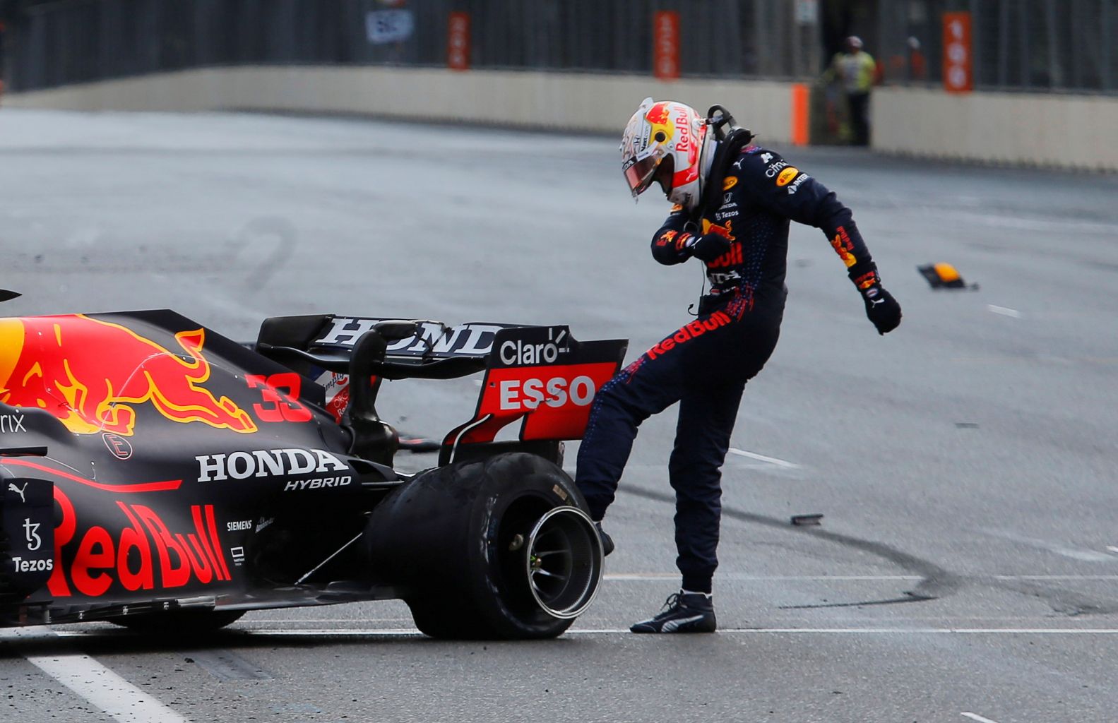 Red Bull's Max Verstappen kicks the wheel of his car after crashing out of the Azerbaijan Grand Prix