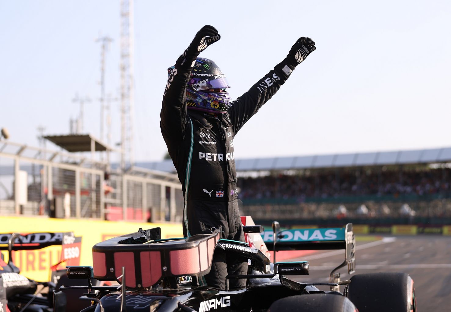 Mercedes' Lewis Hamilton celebrates after finishing first in the sprint race qualifying ahead of the British grand prix.